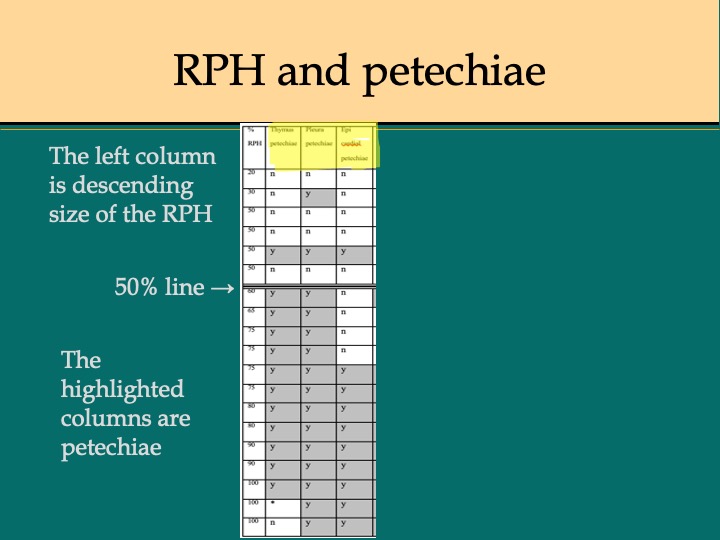A retrospective study of stillborn autopsies attributed to placenta separation ranked the placentas by the extent of separation and correlated that extent with microscopic petechiae and vascular congestion13. The petechiae were present in all cases with up to 75% separation (Fig 3). Smaller separations did not always show intrathoracic petechiae. A reasonable conclusion is that petechiae were associated with severe intrauterine asphyxia. A possible explanation for the absence of intrathoracic petechiae with lesser degrees of separation is that with less hypoxia, the slower development of brain acidosis anesthetized the brain blocking the signal to start breathing.