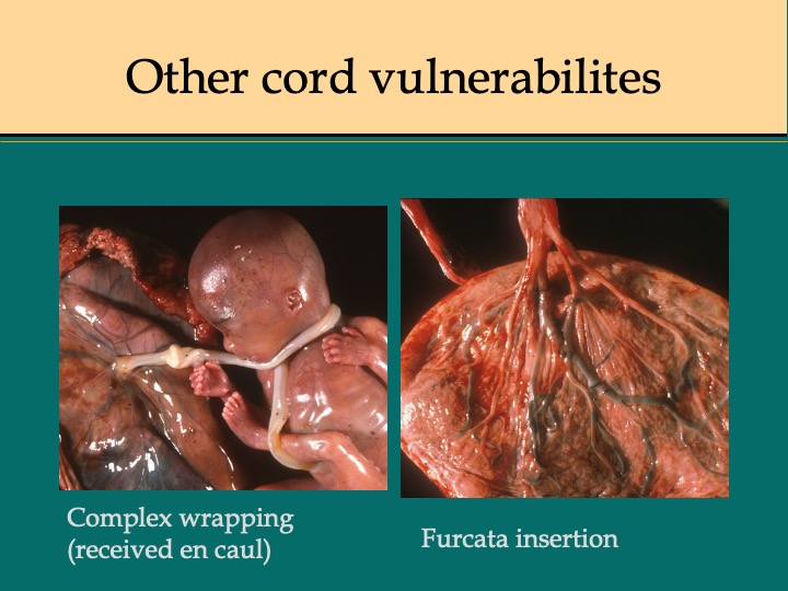 The pathological evidence has led to the hypothesis that some stillbirth without a cause of death are due to asphyxia. This hypothesis does not indicate the mechanism of the asphyxia. Without a visible placental lesion or a convincing maternal history of asphyxia, suspicion falls on the umbilical cord. Many have noted that the umbilical cord is the lifeline of the fetus, much like a deep sea diver’s umbilical line. The experimental studies of umbilical cord induced fetal asphyxia provide no insight in that they relied on manufactured occluders, not on a natural mechanism. A meta-analysis of published reports of umbilical cord and stillbirth found very few acceptable papers for analysis14. Of the lesions considered, only two correlations with stillbirth were significant, true knots of the cord, and multiple nuchal cord wrappings. Both conditions are rare, and both require deeper examination as to how they result in fetal death which will be explained later.