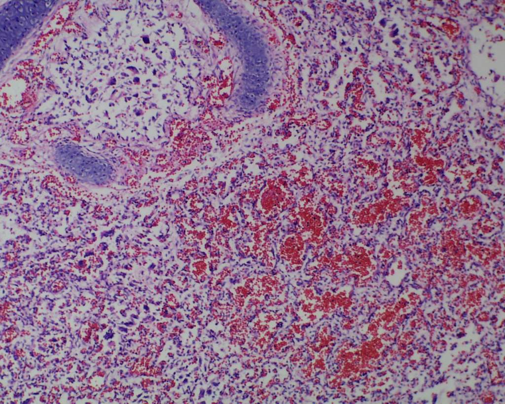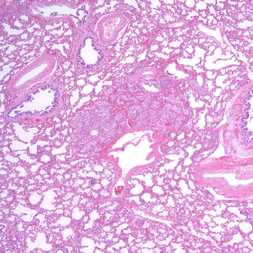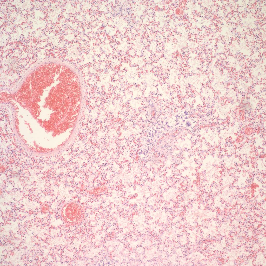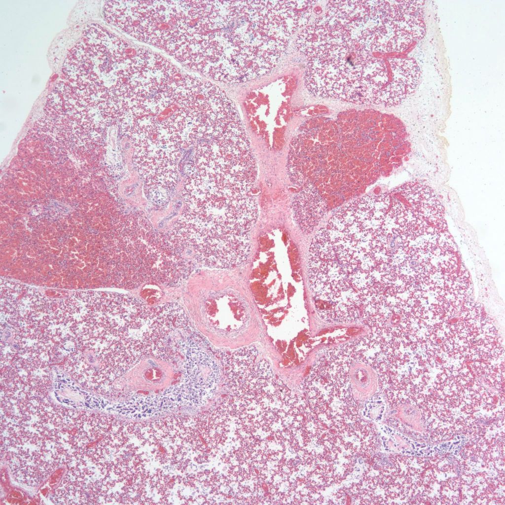 Focal hemorrhages may also be found in the airways usually with evidence of hemorrhages in other organs suggestive of disseminated intravascular coagulation and shock (Fig 21).