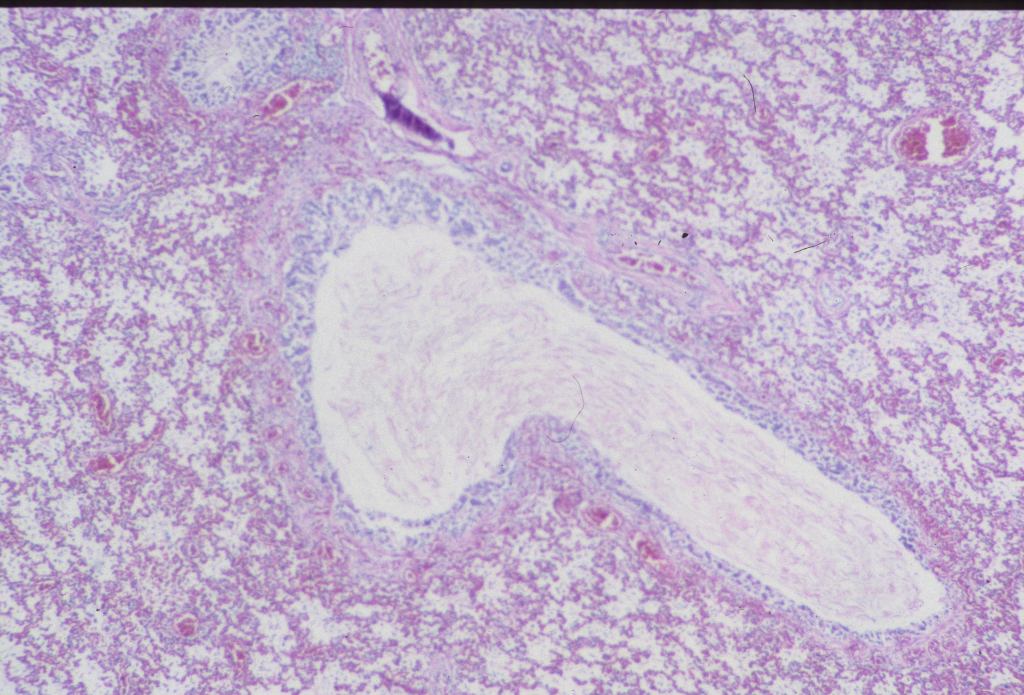 Distal airway expansion: The lung in the fetus is naturally in the unexpanded state. With respiratory effort, even in fluid, there may be some expansion of the air passage. A complicating postmortem event is focal expansion of airways with gas (Fig 25).
