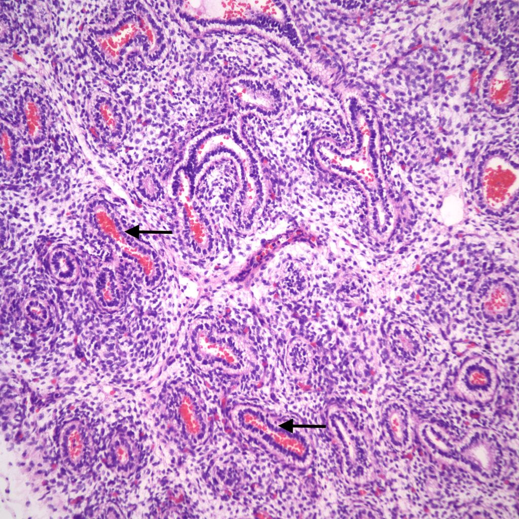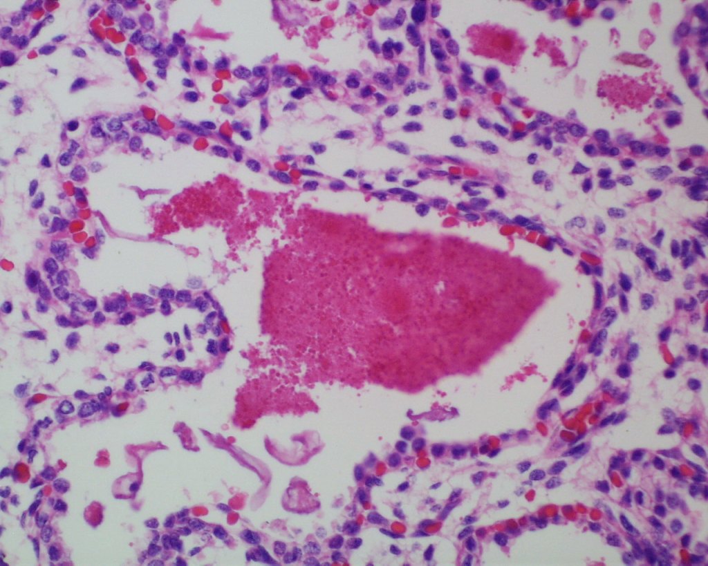 The mechanism for many hemorrhages is obscure. With elevated left atrial pressure, for example with heart failure, but more acutely with closure of the ductus arteriosus, elevated atrial pressure would be reflected in dilatation of the pulmonary veins in the septa (Fig 22).