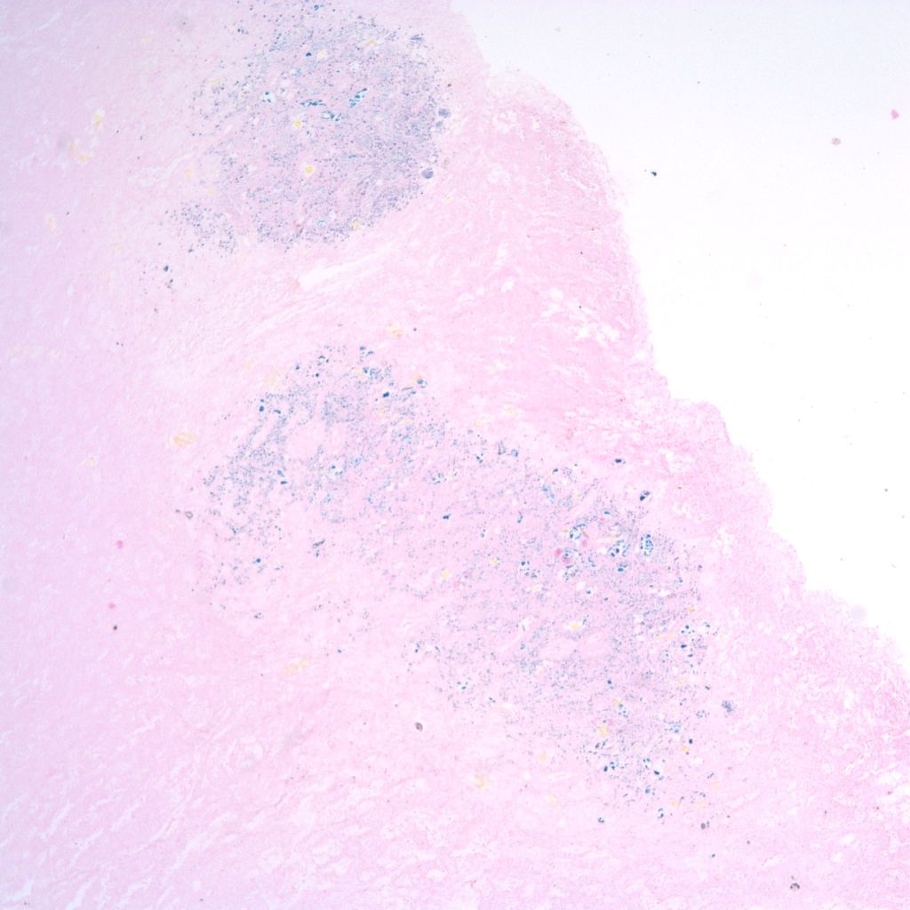 In severely autolytic lung, the distinction between intrinsic hemorrhage and aspirated blood may not be discernable with only iron staining for hemosiderin to trace the vestige of the hemorrhage (Fig 24).