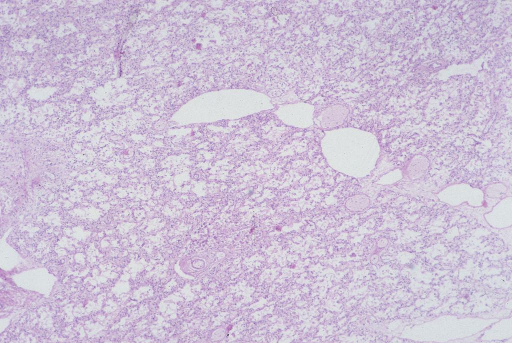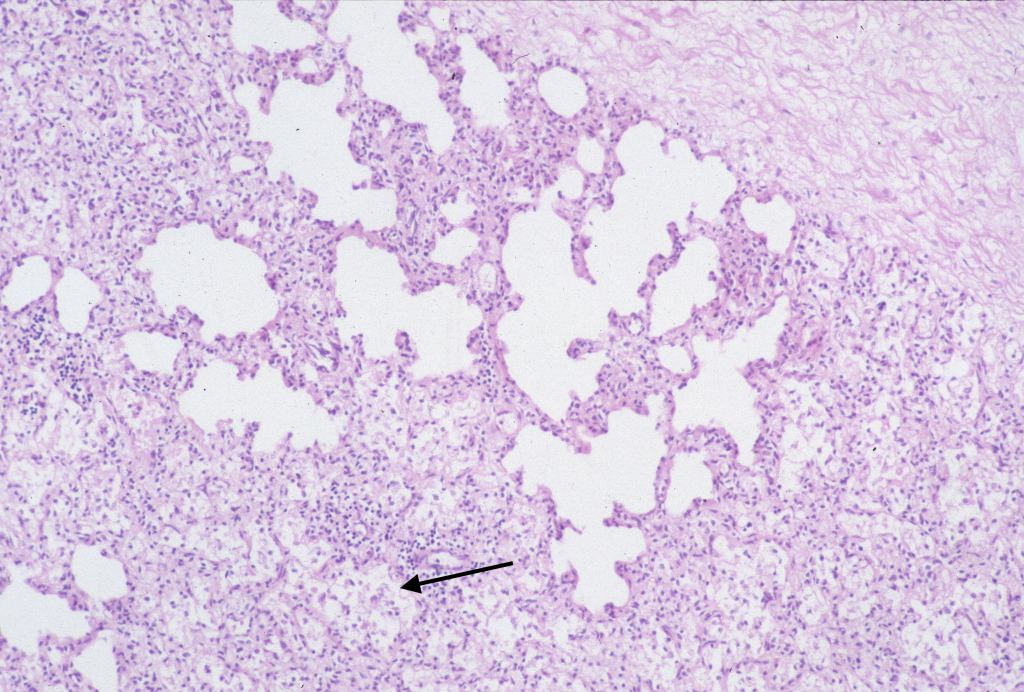Pulmonary hypoplasia microscopic: With standard sections of the lung, pulmonary hypoplasia may demonstrate smaller lobules and a sheared appearance of the parenchyma compared to similarly sectioned gestationally matched controls (Fig 26). Radial alveolar counts can quantify that appearance by counting the septa crossed by a straight line from the most distal bronchiole to the pleural surface and comparing to expected numbers at gestation18.