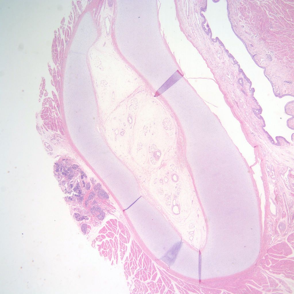 Postmortem retention: The bronchial epithelial cells demonstrate loss of nuclear basophilia at more than 96 hours of postmortem retention. The tracheal cartilage loses nuclear basophilia after 1 week of postmortem retention. Loss of basophilia is defined as at least 1% of nuclei are entirely devoid of basophilic staining15. (Fig 8)