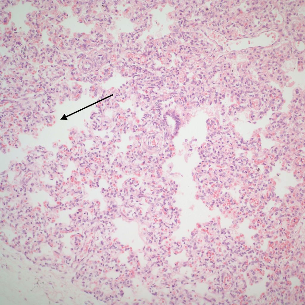 However, the karyorhectic cells lack the intact cytoplasm of neutrophils. It is not possible to observationally determine whether neutrophils in the airway are from aspiration of neutrophils in the amniotic fluid, or are from fetal neutrophils in response to aspirated bacteria. The exception is with focal bronchopneumonia which demonstrates a fetal inflammatory response with large, focal accumulations of neutrophils and vasodilatation of surrounding capillaries (fig 12a,b).