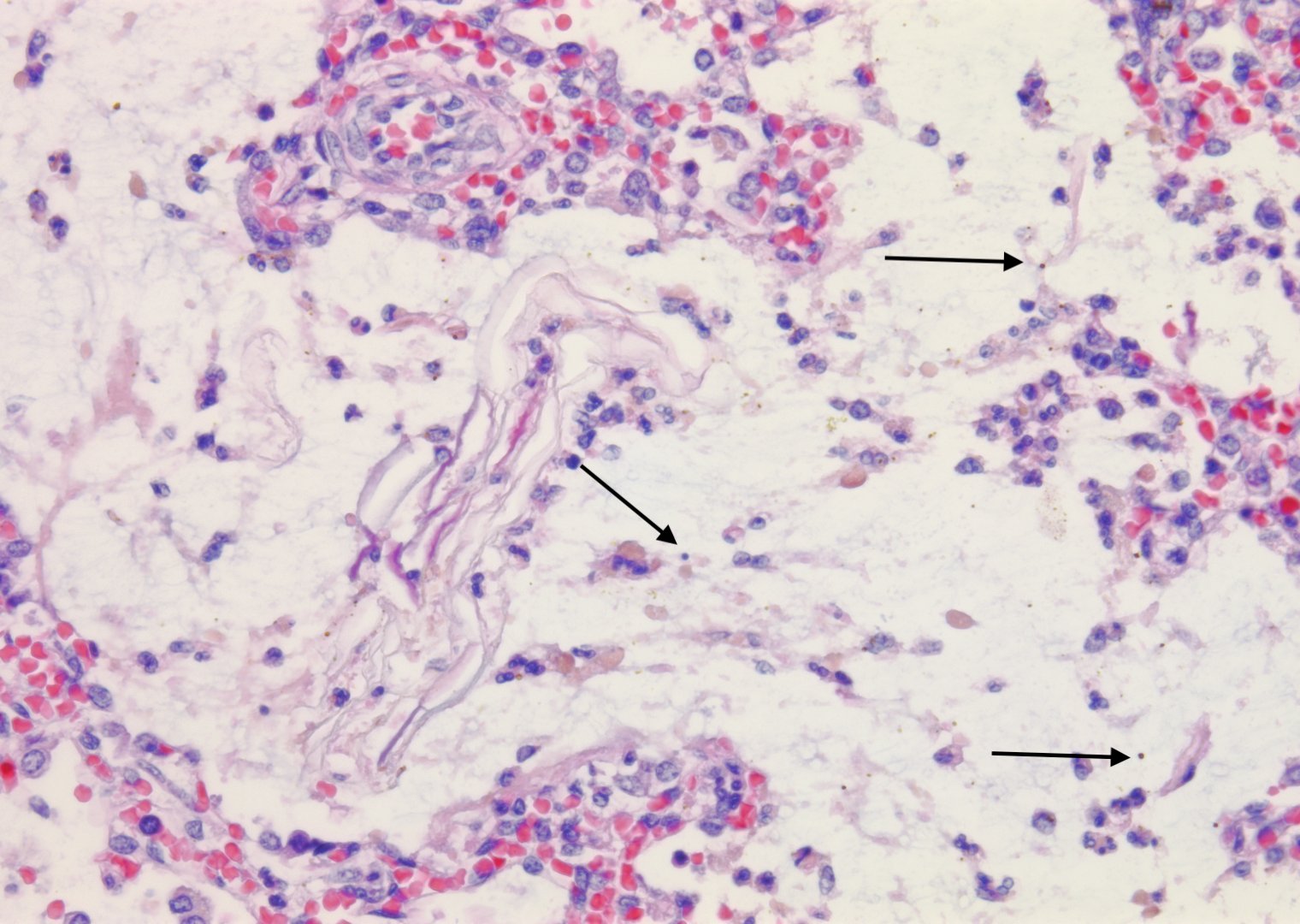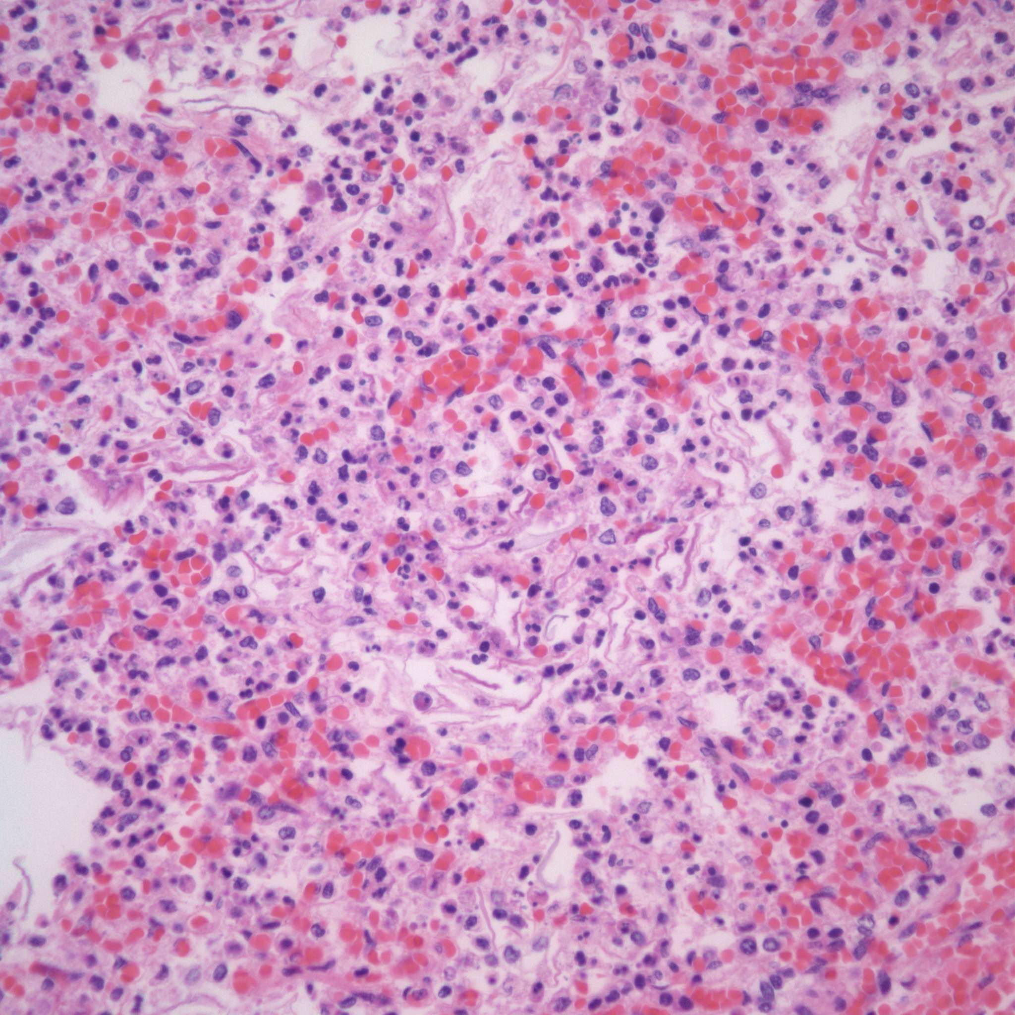 Giant cell pneumonitis and interstitial pneumonitis can also be seen in stillbirth, but these features do not indicate a specific etiology19. Fungal, viral and protozoic should be excluded (Fig 14a-c).
