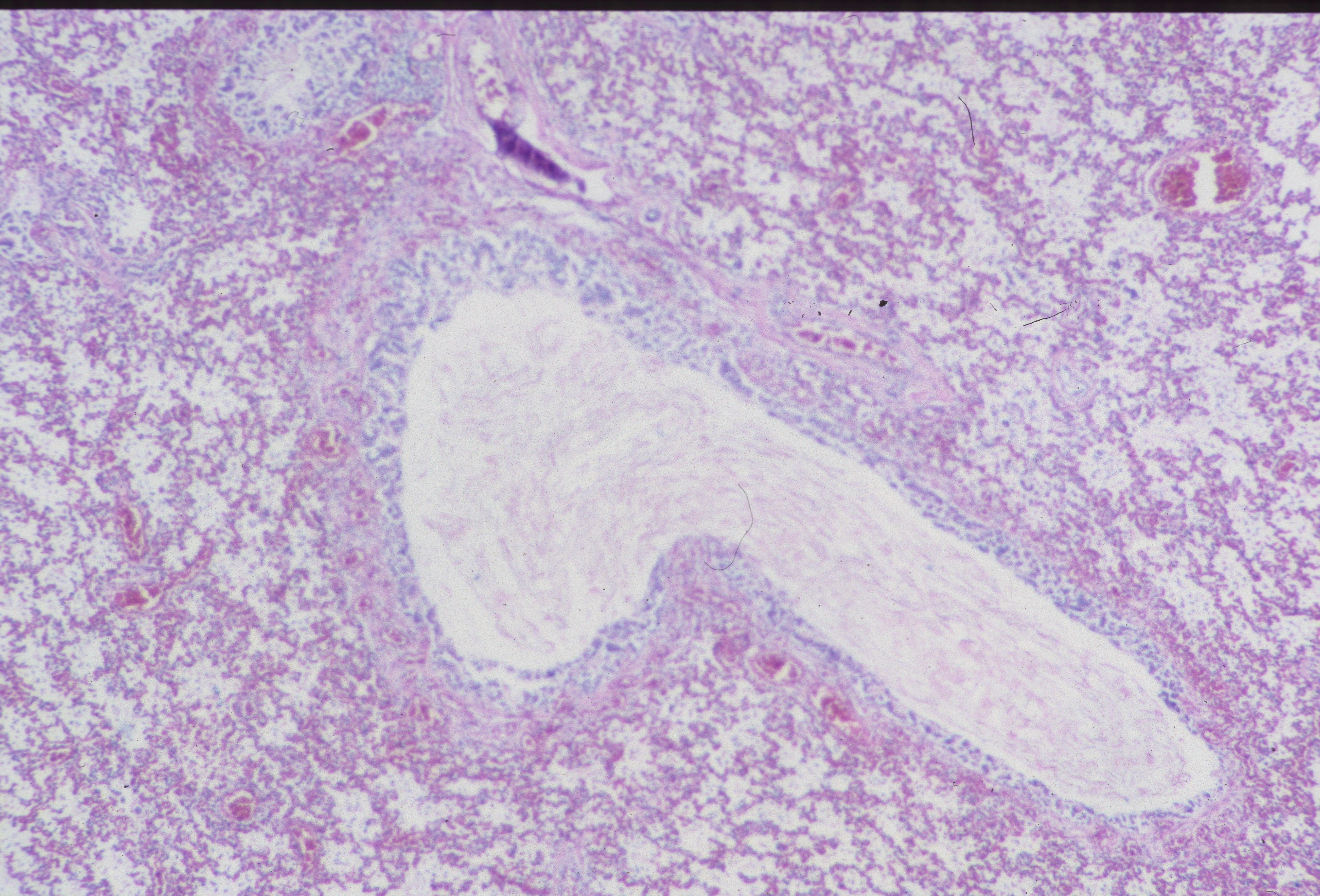 Sampling: One system of taking samples for microscopy that facilitates both identifying the lobes on the slide and obtaining two perspectives of a branching system of bronchioles, is to slice the lung perpendicular to the main bronchus in the upper lobe, and parallel in the lower lobes. The cut sections of the lung may reveal aspirated material, or may demonstrate focal lesions usually hemorrhagic areas that can be sampled (Fig 7). Occasionally, usually in infants with oligohydramnios, there may be a pale focus from a congenital cystic adenomatoid malformation.
