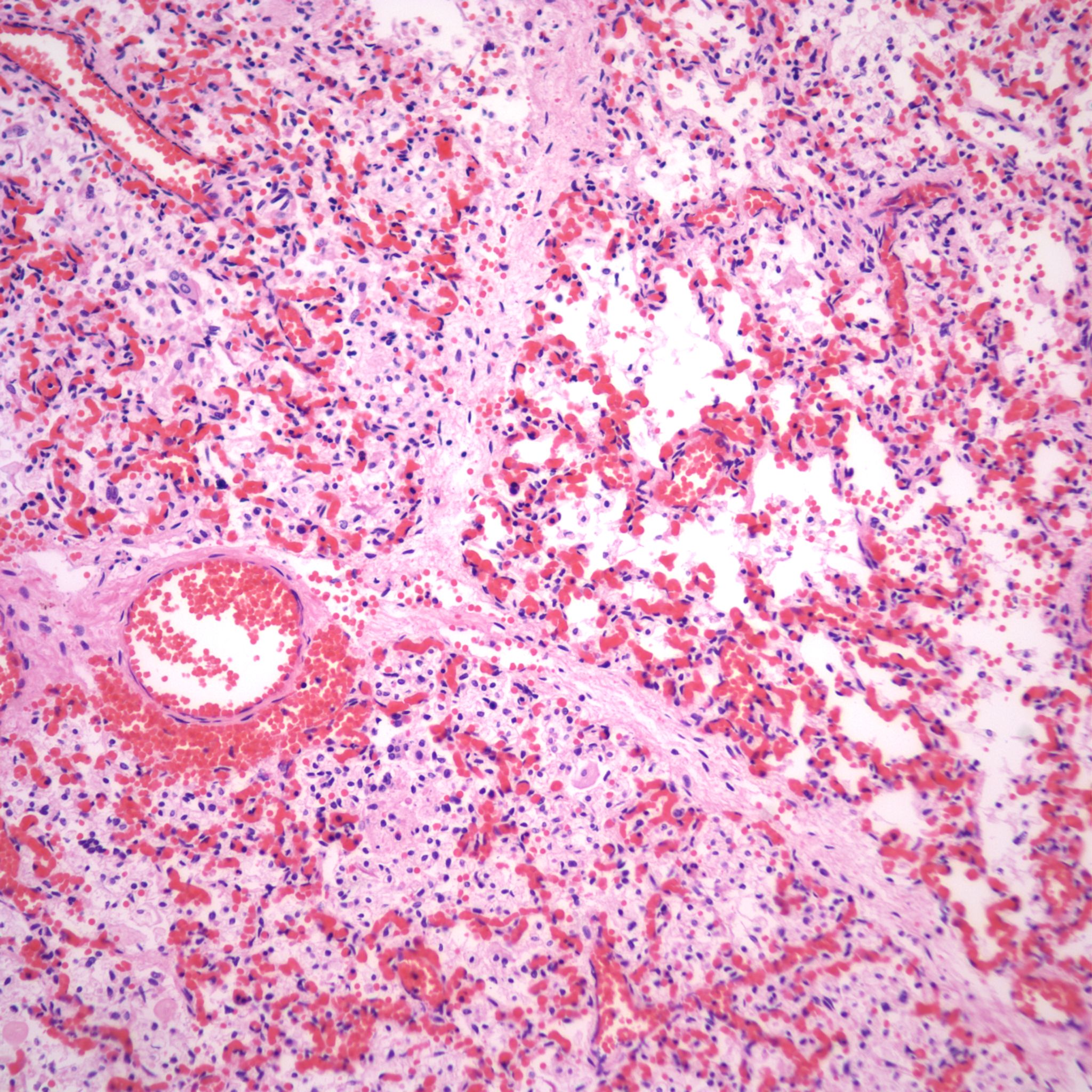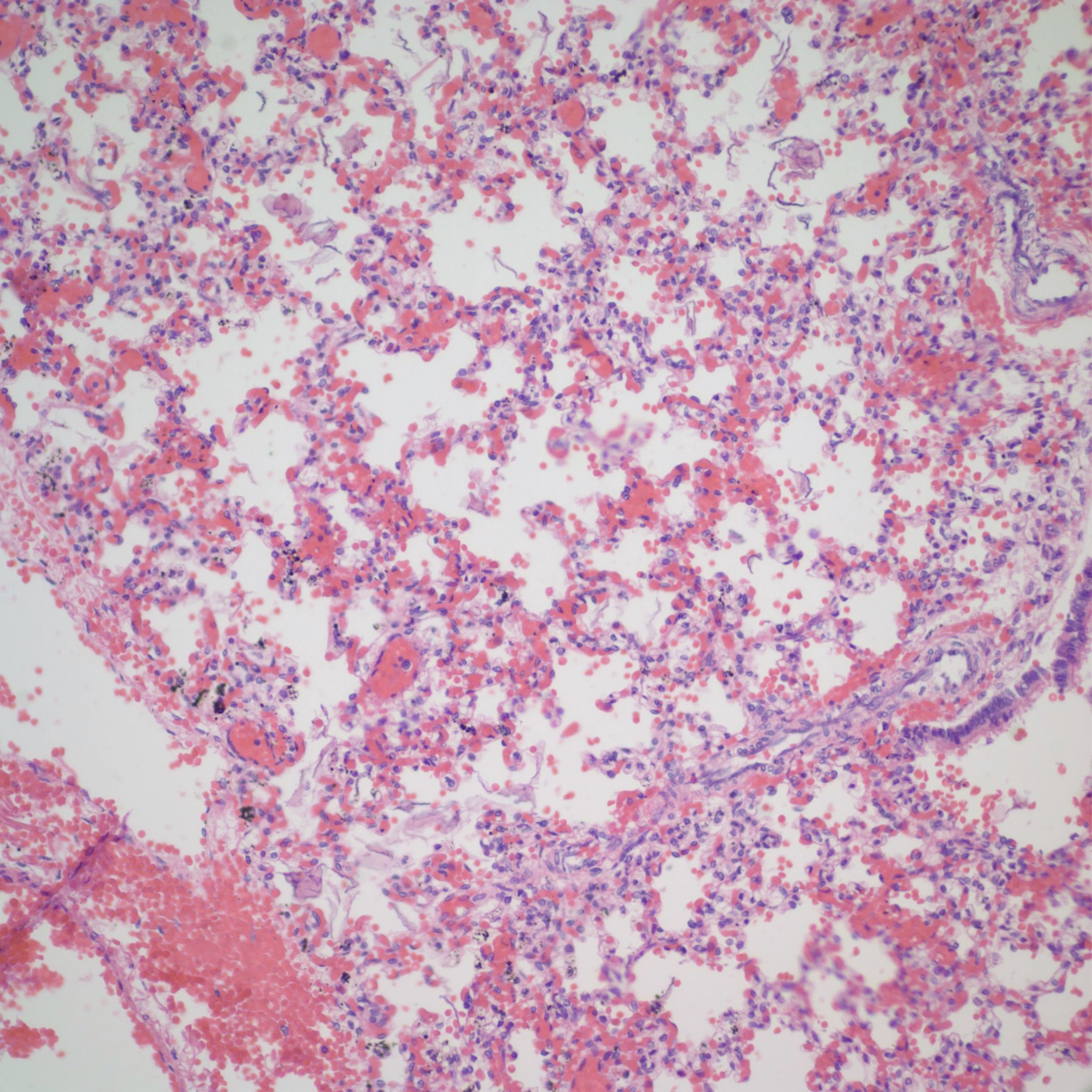 Focal hemorrhages may also be found in the airways usually with evidence of hemorrhages in other organs suggestive of disseminated intravascular coagulation and shock (Fig 21).