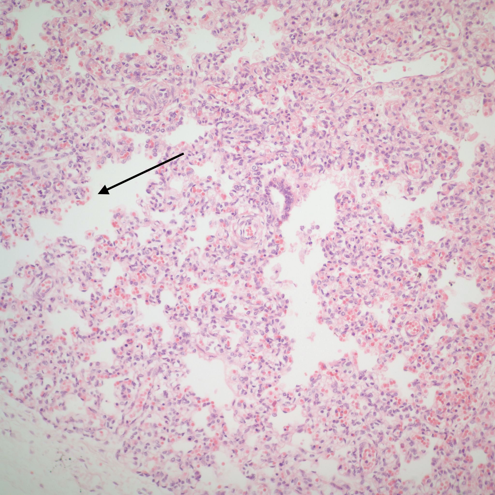 Pulmonary hypoplasia microscopic: With standard sections of the lung, pulmonary hypoplasia may demonstrate smaller lobules and a sheared appearance of the parenchyma compared to similarly sectioned gestationally matched controls (Fig 26). Radial alveolar counts can quantify that appearance by counting the septa crossed by a straight line from the most distal bronchiole to the pleural surface and comparing to expected numbers at gestation18.