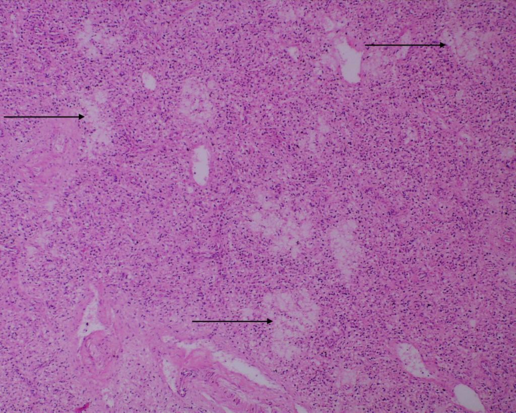 Fig 10: The arrows point to gas bubbles in the spleen. This 27 weeks of gestation infant had more than 96 hours of postmortem retention. The placenta had multiple infarctions. (10x, H&E)