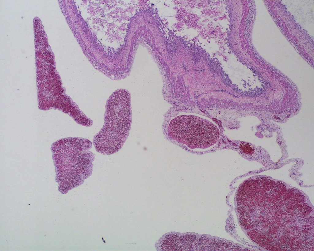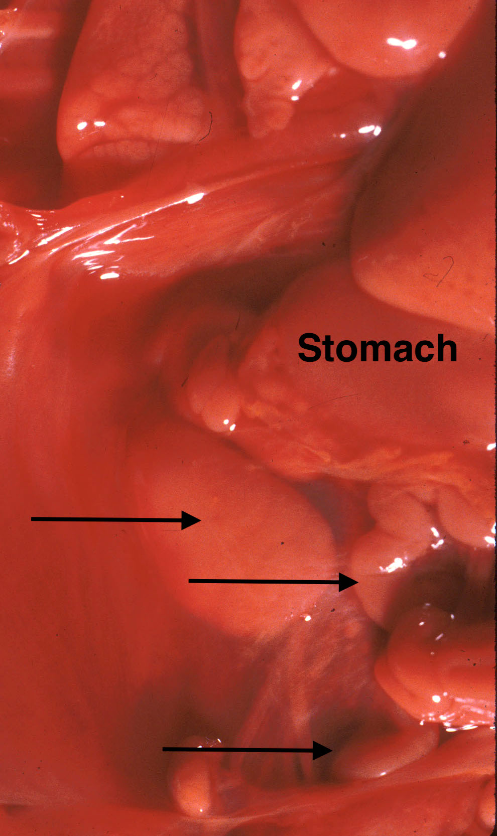 The most common gross abnormality is enlargement. There may be increased size/weight from passive congestion with heart failure, but it is lymphoid hyperplasia from blood borne fetal infection that produces gross splenomegaly (Fig 2). The average spleen to brain weight ratio is 0.022. The spleen can easily be removed and weighed. A flat longitudinal sample maximizes the histologic area.