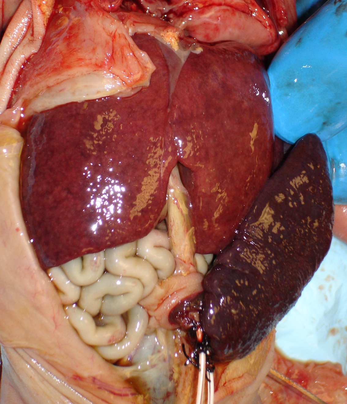 The spleen is easily located along the left edge of the stomach. Looking at the organ from the posterior, the tail of the pancreas reaches to it. By lifting the tail, pancreas can easily be dissected free toward the duodenum. The spleen is occasionally malformed, for example trisomy 13, or demonstrates small splenules at the splenic periphery. In heterotaxy syndromes, there may be asplenia or polysplenia, and the multiple spleens are often on the right side of the body1 (Fig 1).