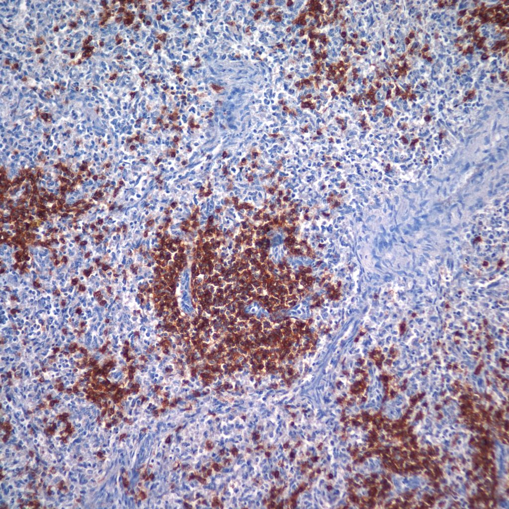 Fig 4a: This slide is stained for B-cells (brown stain) which are increased. The arrows point to the expansion of the B-cells eccentrically to the arterial cuff. This 22 weeks of gestation infant with premature rupture of membranes and chorioamnionitis had beside B-cell proliferation in the spleen, complete thymic involution, pneumonitis, and white matter necrosis. A postmortem lnung culture did not grow bacteria. The infant survived 45 minutes. (2x, CD20)Fig 4b: The proliferation of B cells (brown stain) beyond the usual arterial cuff of lymphocytes is present. This 22 weeks of gestation infant was an intrapartum death following preterm labor. There was a grade III intraventricular hemorrhage in the brain, but no evidence of intrauterine or fetal infection. There was also an acute subcapsular liver hematoma and skin bruising. There were no studies of platelet antigens. (20x, CD20)
