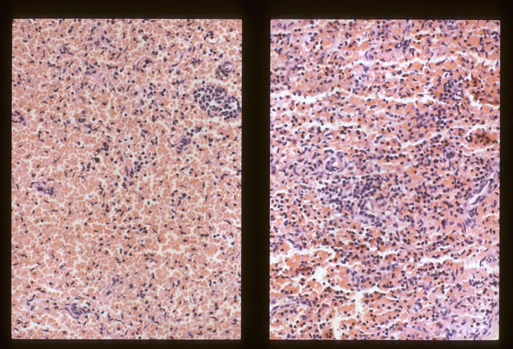 Fig 6a: This image compares the spleen in acute twin-to-twin transfusion. The twin in the left panel is the recipient of the acute transfusion and shows the sinuses distended with blood compared to the sibling. The twins were 33 weeks of gestation with 12-24 hours of postmortem retention. (20x, H&E)Fig 6b: This spleen demonstrates an almost complete absences of red cells in the sinuses except for some probably nucleated red cells, mixed with leukocytes. The infant died from fetal to maternal hemorrhage at 27 weeks of gestation followed by 48-96 hours of postmortem retention. There were multiple intervillous thrombi in the placenta and a family history of Marfan’s disease. (40x, H&E)