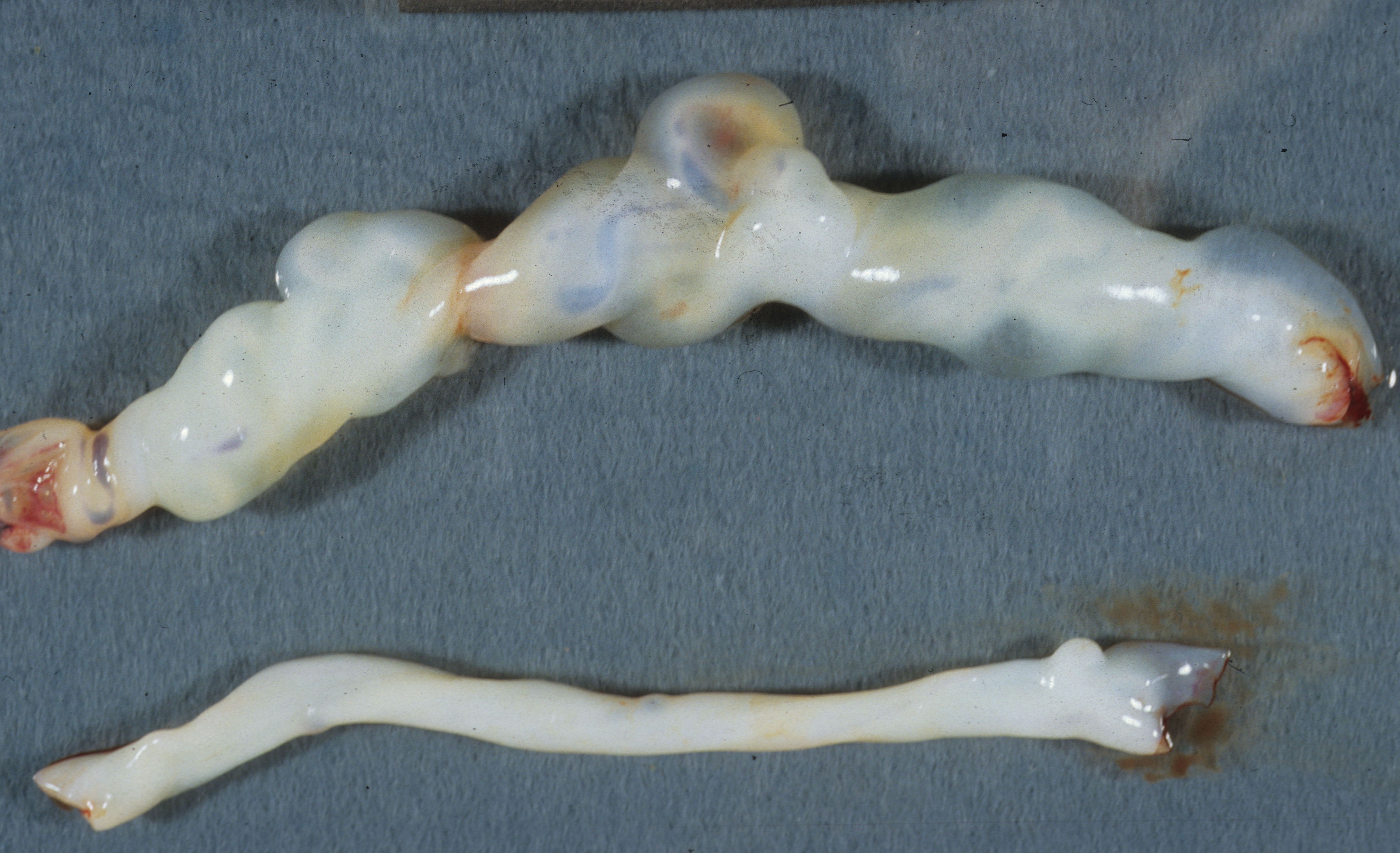 2) Marked focal widening should be examined by the pathologist and appropriately sampled. Patent urachus is rare, but marked widening of the cord more toward the fetal end with only edema on cut-section requires the exclusion of that diagnosis. If it is suspected, the nursery should be notified. Even more rarely, a proximal thickening is due to gastrointestinal tissue from the omphalomesenteric remnant (Meckel diverticulum) which also needs prompt diagnosis and notification of the nursery21,22. Other causes of focal thickening will be discussed elsewhere.
