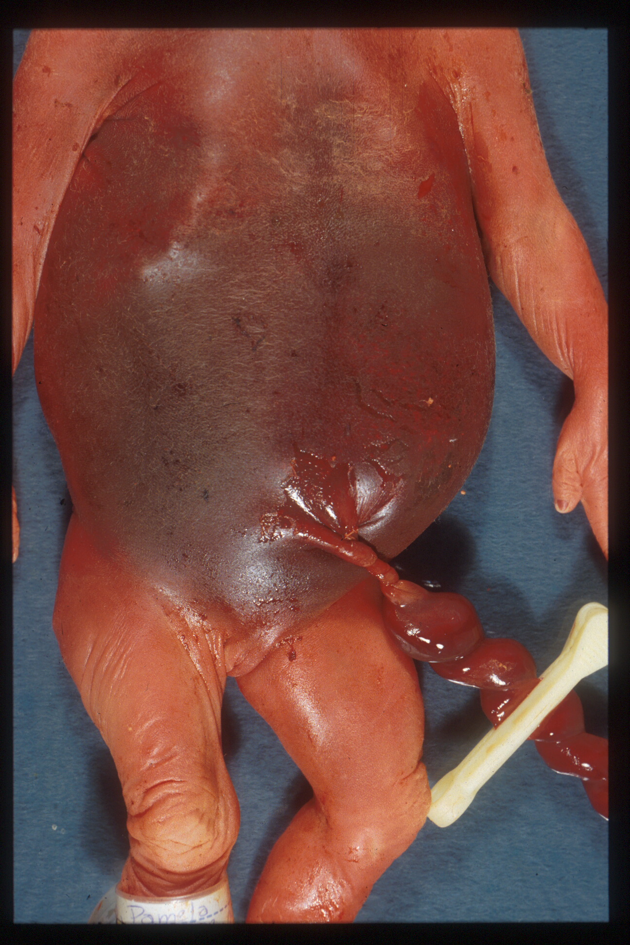 Figure 3 The umbilical cord is tightly coiled as seen in this photo near the umbilicus. This fetus died of a 50% retroplacental hematoma (placental abruption) with progressive heart failure from hypoxia. The histology of the twisted cord did not show acute inflammation or fibrin deposition.