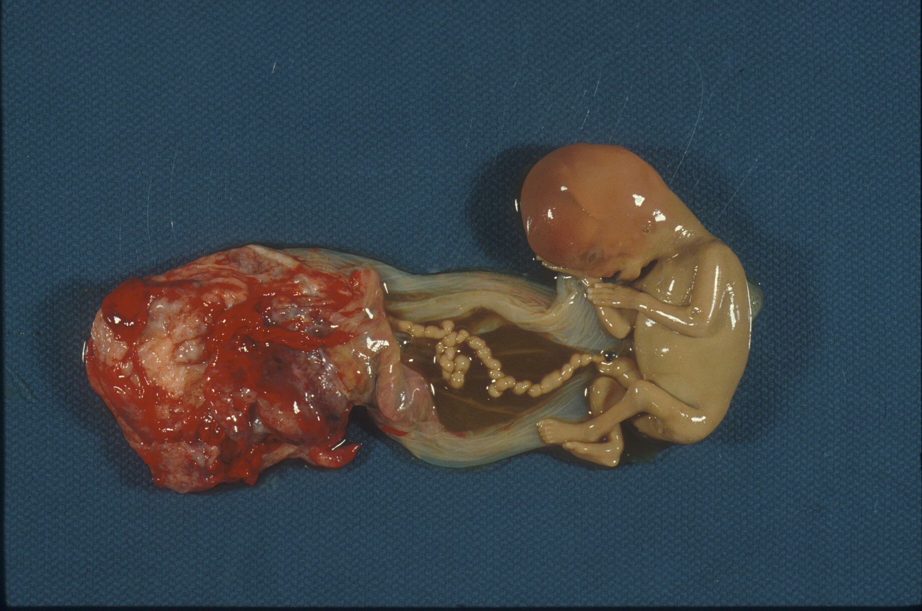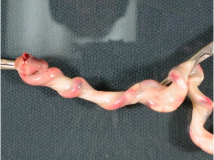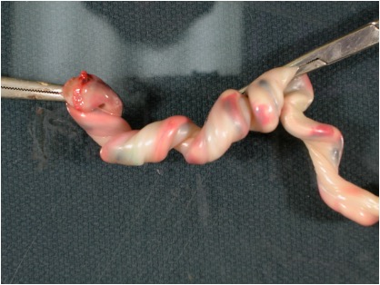Figure 4 A first trimester fetal loss still attached to the placenta with the long, hypercoiled, deep groove patterned umbilical cord