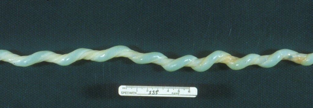 Figure 1 This segment of an umbilical cord in which the umbilical vein was perfused with green dye demonstrates that the vascular helix is follows the external helix of the cord.