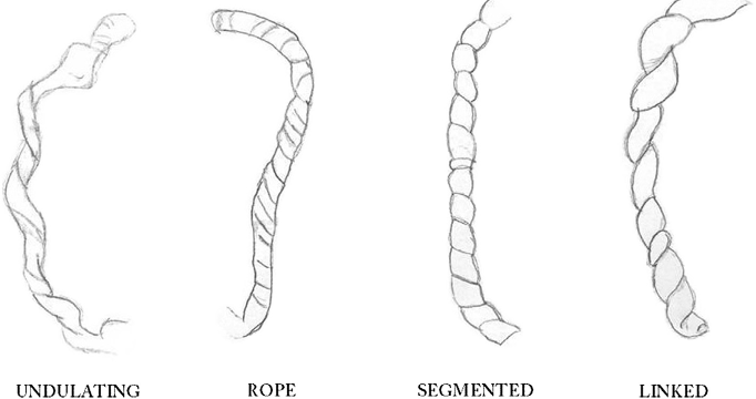 A study tested the observation that different morphology of the umbilical cord would have different clinical associations11. The study proposed 4 classifications of the types of coiling, which were later in the analysis divided into just two categories. The illustration from the paper is reproduced below.